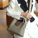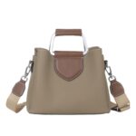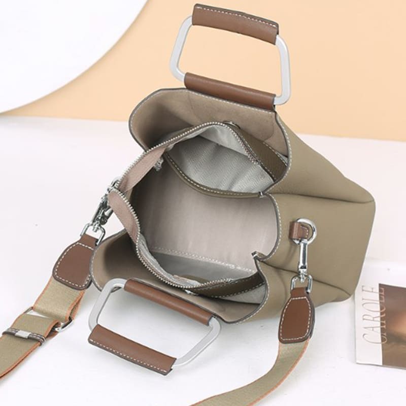 The town bucket bag is with 2 kinds of straps for carrying. 1 shorter handle strap is for hand carrying comfortably, another long shoulder/crossbody strap is adjustable to match the preferred length you desire.